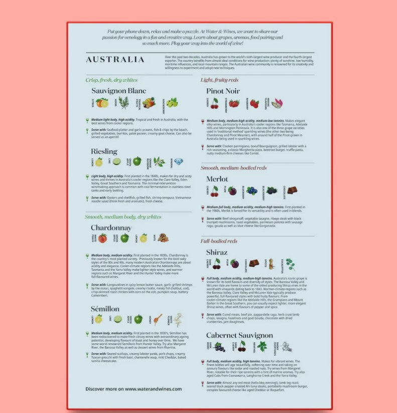 Our grape profiles and food-pairing tips are included in the puzzle box, making it a complete wine-learning experience.