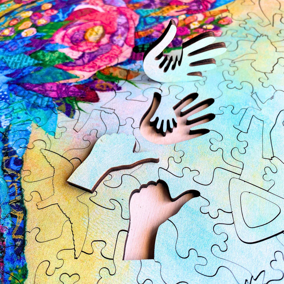 The vibrancy and array of bold and bright colours that can be found in the wings of this botanical swallow jigsaw puzzle makes this truly spectacular. The whimsy pieces you will find in this puzzle is matching hands, rabbits, swans, hearts and more.