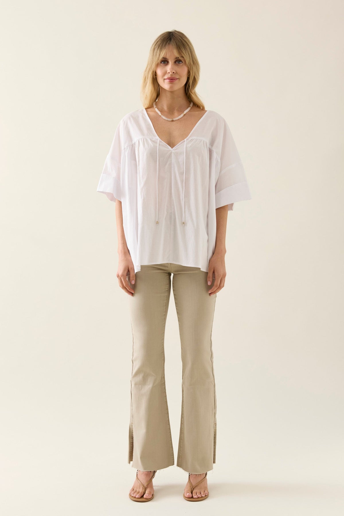Designed for comfort and movement, the Aurora Relaxed Top features a flattering V-neck at front and back, a dropped sleeve with cuff, and neck ties finished with gold beads. The cotton voile fabric gives it an airy feel.