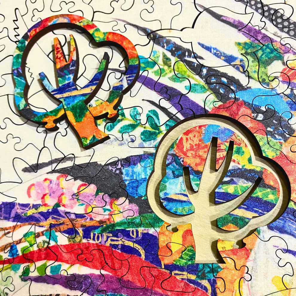 This wooden jigsaw puzzle is a beautiful, bright and colourful collage artwork of the black cockatoo from Lisa Morales. You will find an array of multi level shapes that need to be fitted into one another along with boots, flying birds and so much more.