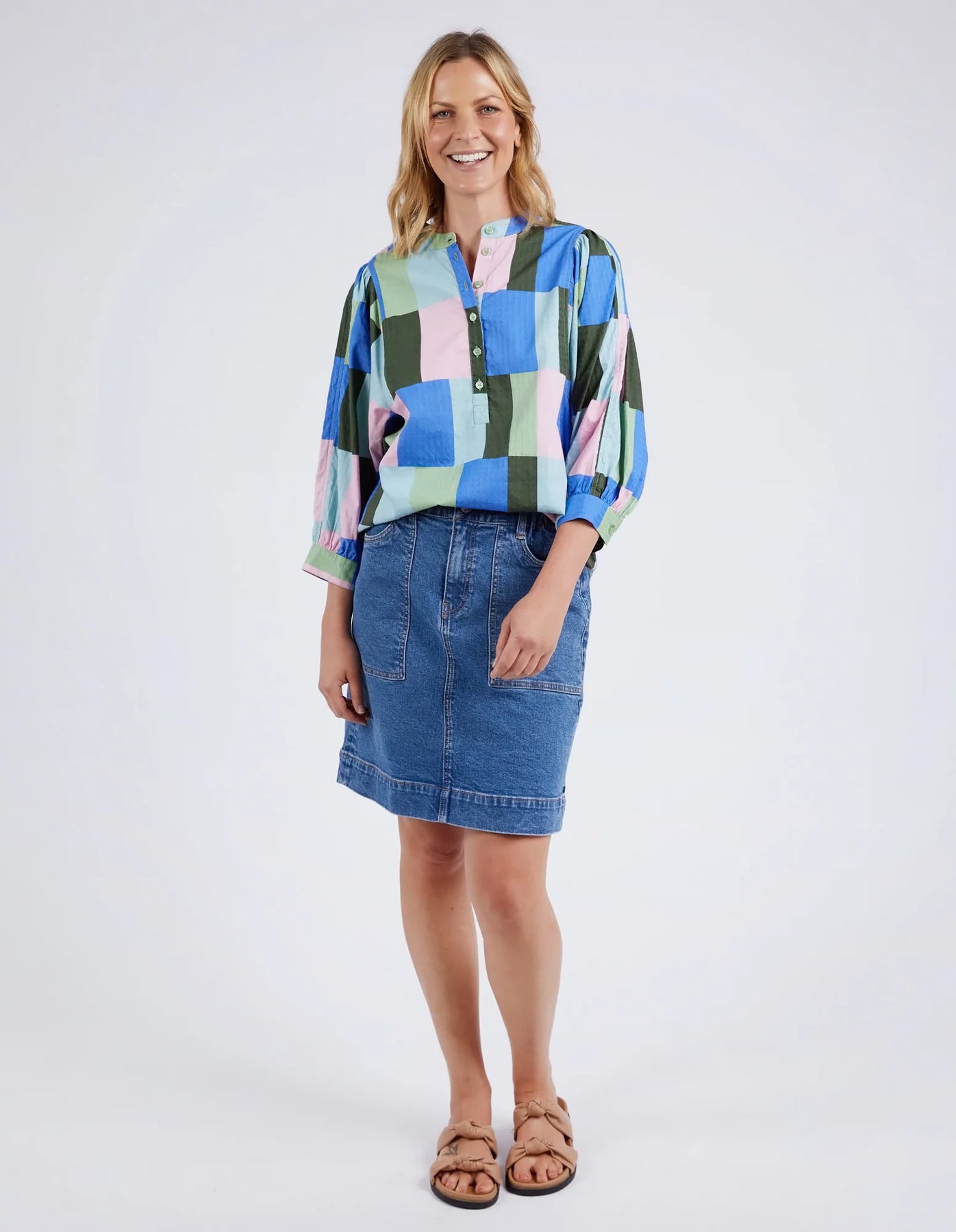 A best selling style in a fresh new colour pop print. mixing up gorgeous blues and green with a subtle pop of pink, this pretty print shirt is a gorgeous all-rounder that will look great atop your favourite denim, or match with the odyssey pants for the ultimate in seasonal style.