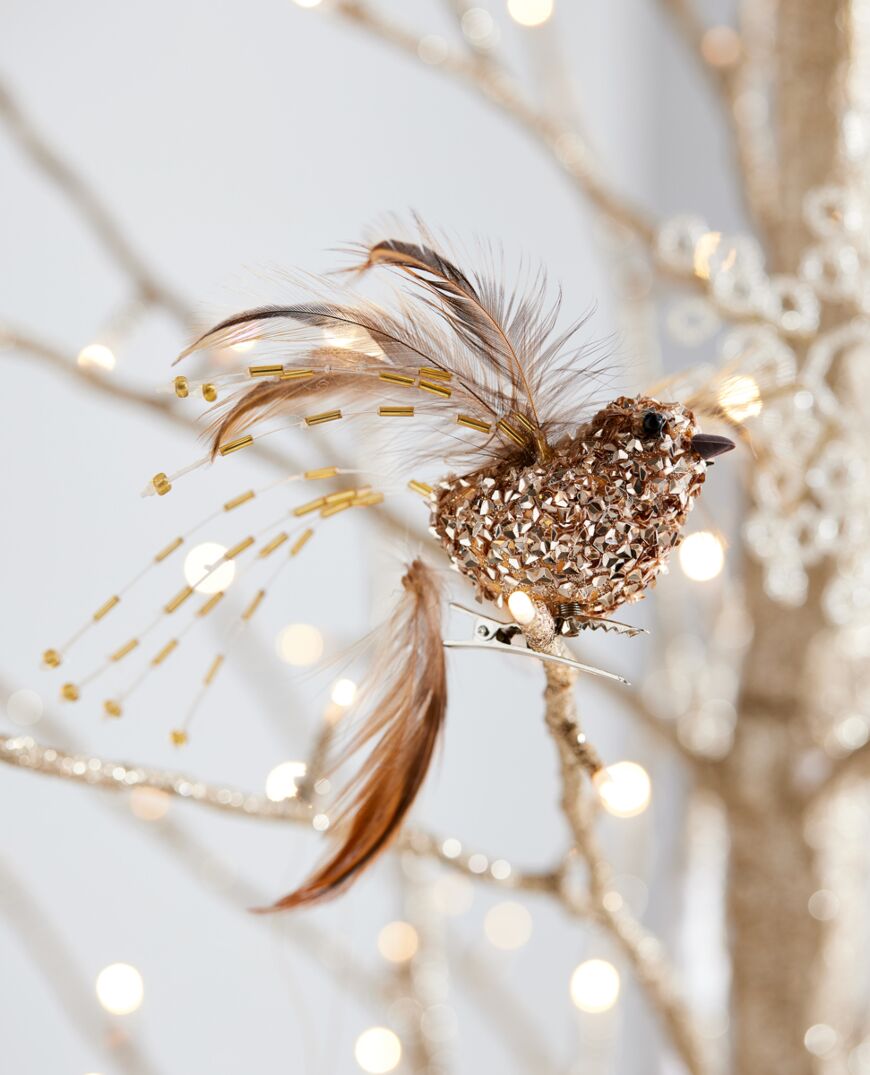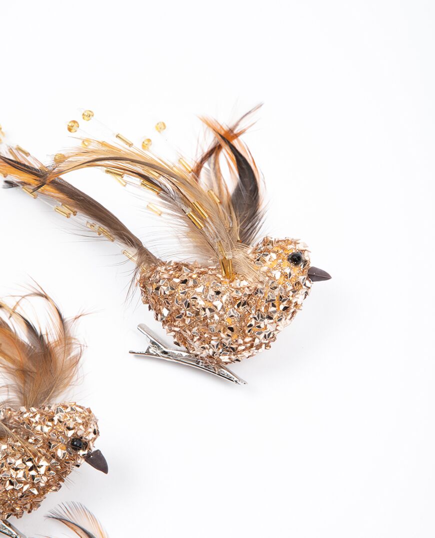A fun and fancy bird with sparkles; gems; and free flowing feathers. The bird is attached to the clip with a small disguised spring to give it the appeance of natural; life-like movement.